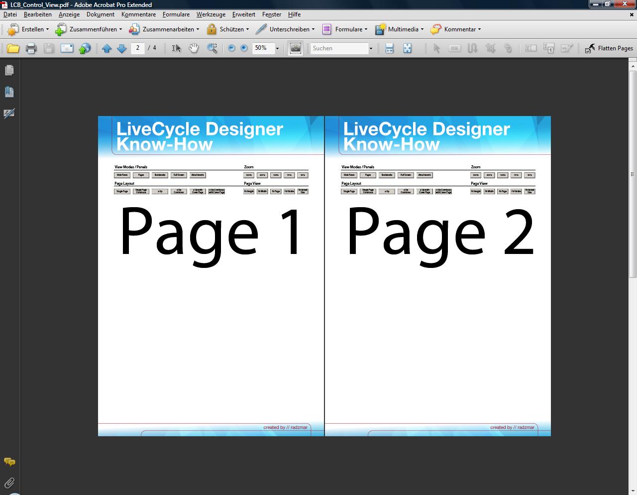 Ob einzelne Seite, zwei Seiten fortlaufend, mit Lesezeichen-Panel, an die Breite angepasst usw., vieles ist möglich, aber nur nachträglich über das Menü.