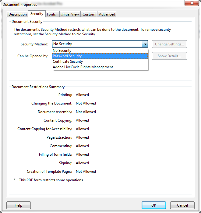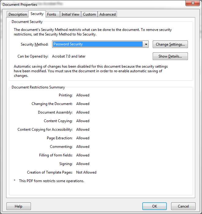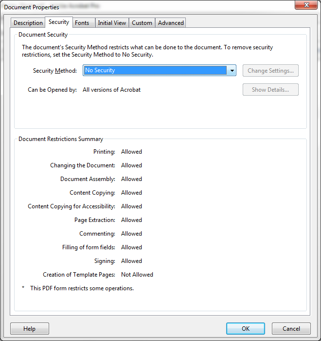 Step 6 – … Acrobat removes most of the Document Restrictions from the form. That's exactly what we need, so click [OK] to save the current document properties.