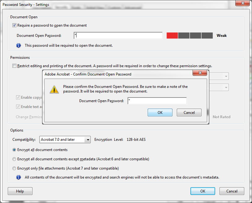 Step 3 – Enter a password to open the document and confirm it in the following dialog. You don't have to enter any strong password — a single character is enough.